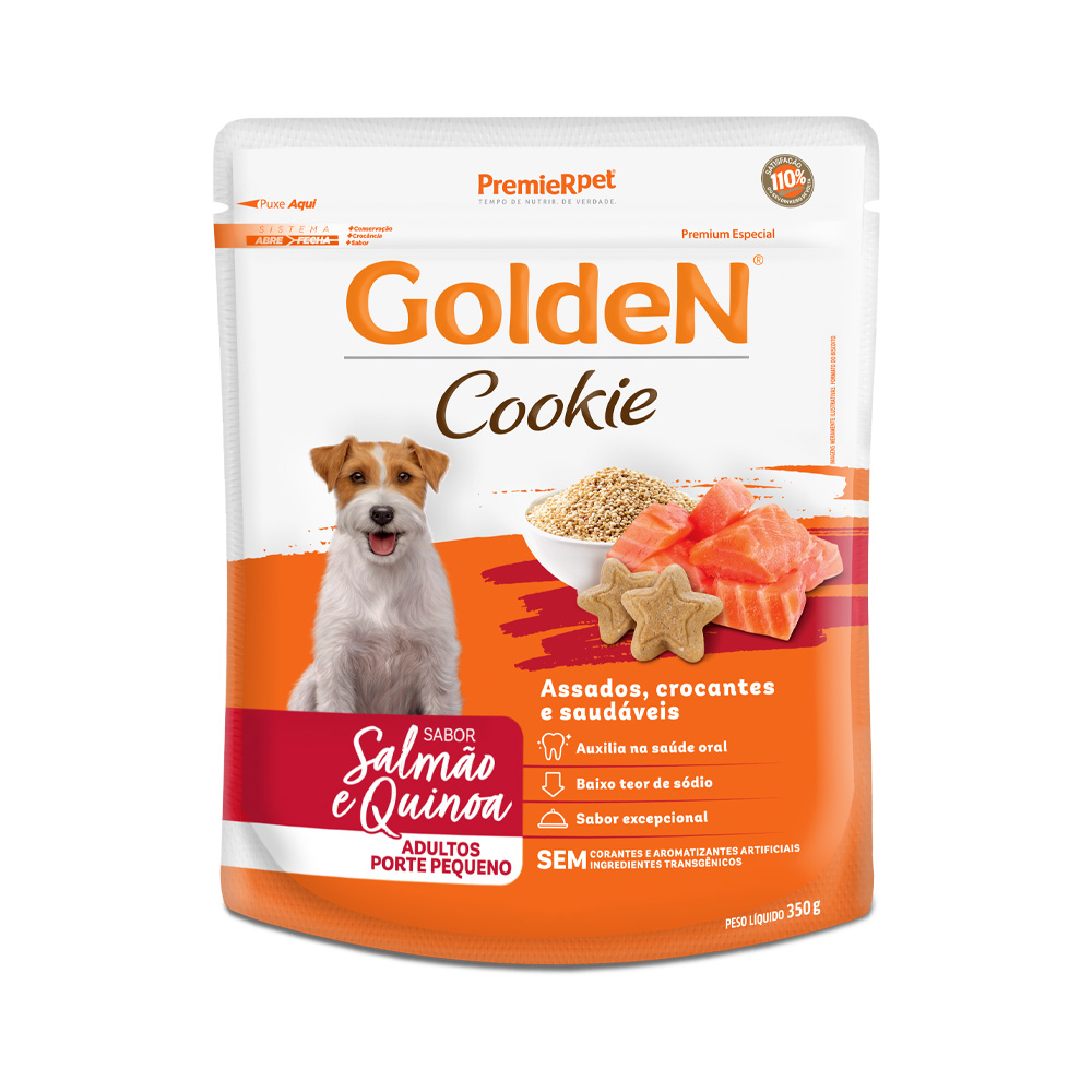 Farinha de trigo, proteína isolada de suíno, ovo desidratado – proveniente de galinhas livres de gaiolas, albumina, leite desnatado em pó, quirera de arroz, amido de milho, dextrina, fibra de trigo, colágeno hidrolisado, farinha de salmão (4%), gordura suína, hidrolisado de suíno e frango, quinoa em flocos (1,5%), corante natural urucum, antioxidantes BHA e BHT (0,012%), bicarbonato de sódio, hexametafosfato de sódio (0,1%).
